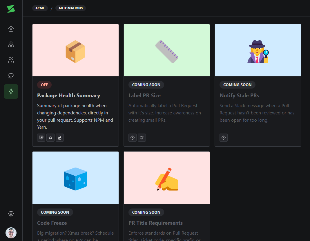 Automations are plug-n-play no-code improvements you can add to your organization in a single click. Think of them as an opinionated easier version of GitHub Actions for specific purposes. Each automation can improve one or more areas of your engineering organization, we categorize them as:Improves tech debt