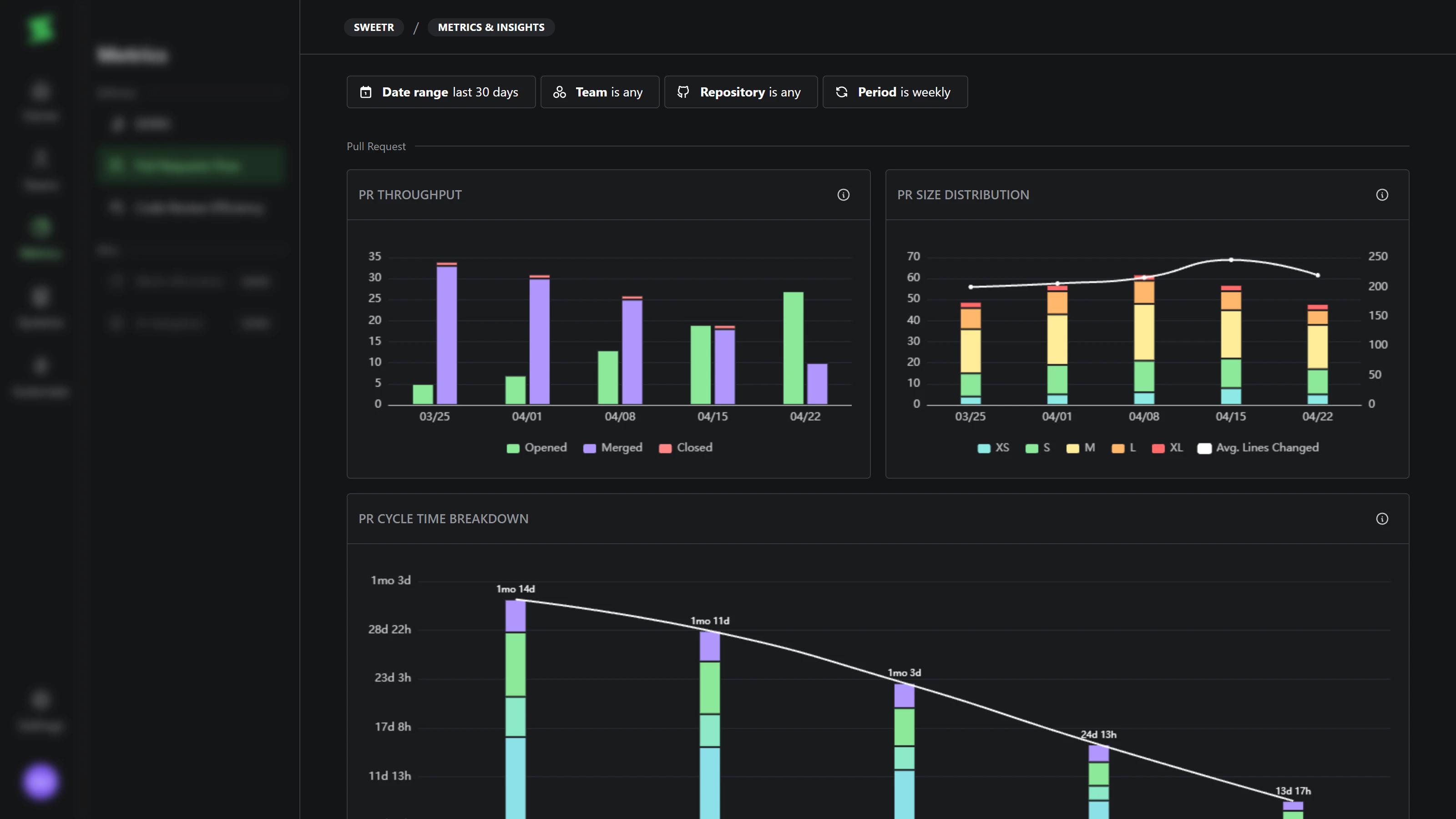 The Pull Request flow dashboard visualizes how your team ships code: throughput, batch size, and where cycle time is spent. All charts respect the same filters at the top of the page:- Date range — the window of PRs to include.