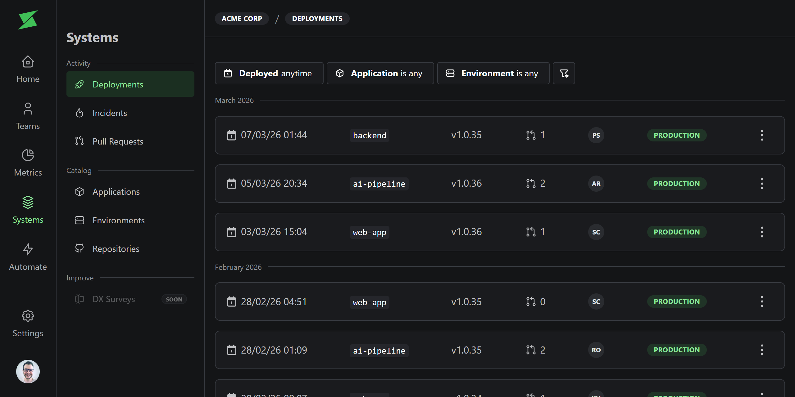 Deployments track when a version of an application is deployed to an environment. Each deployment records the version, commit hash, environment, and linked pull requests. Filter deployments by application, environment, and date range to find exactly what you need.Change type
