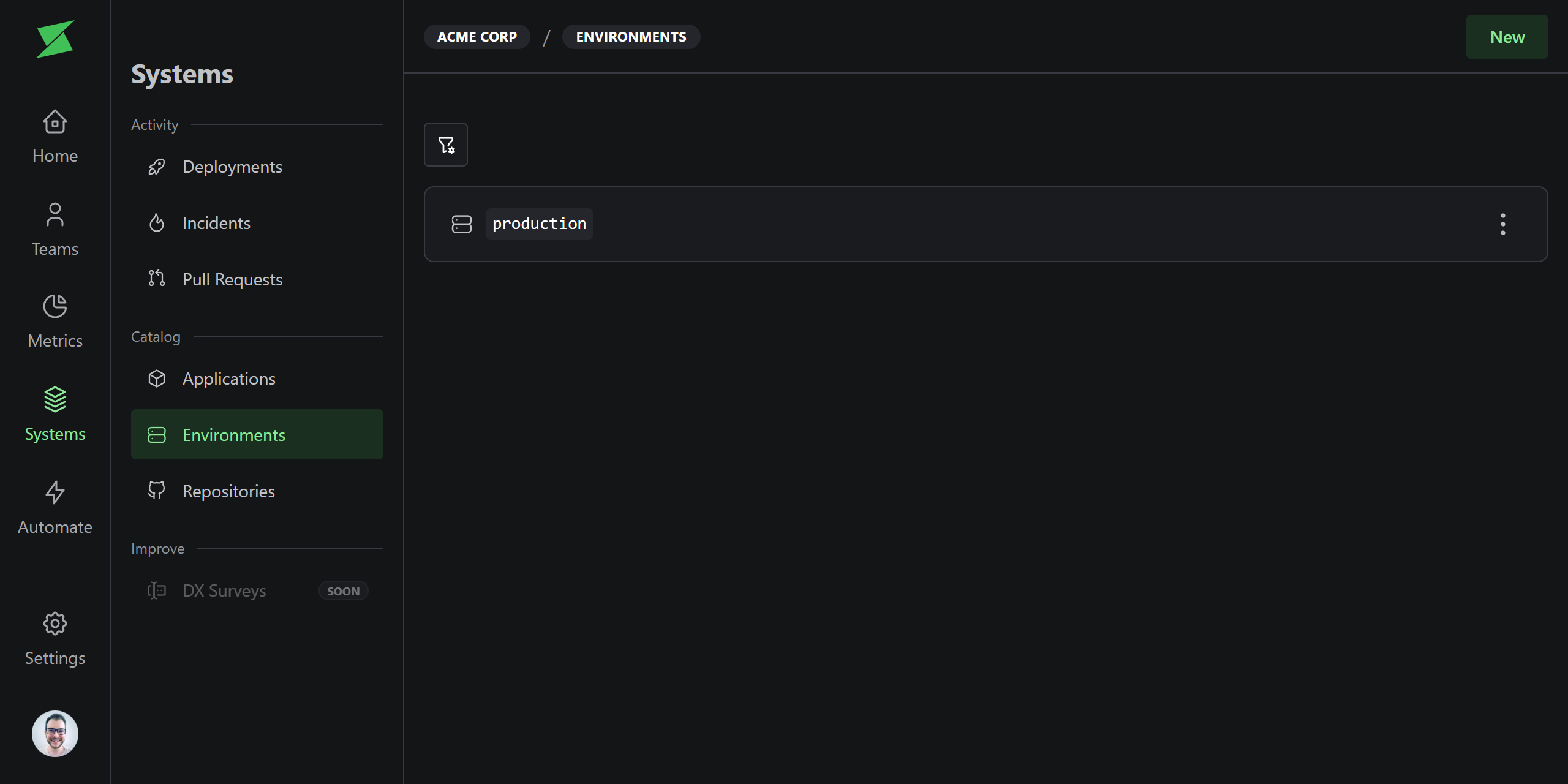 Each environment has anisProduction flag. This matters because DORA metrics default to production environments only. Non-production deployments are excluded unless you explicitly filter for them.
